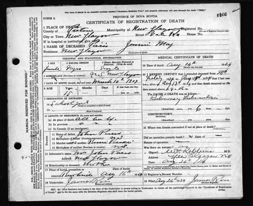 Death Registration: Year: 1924 file: 99 number: 1100