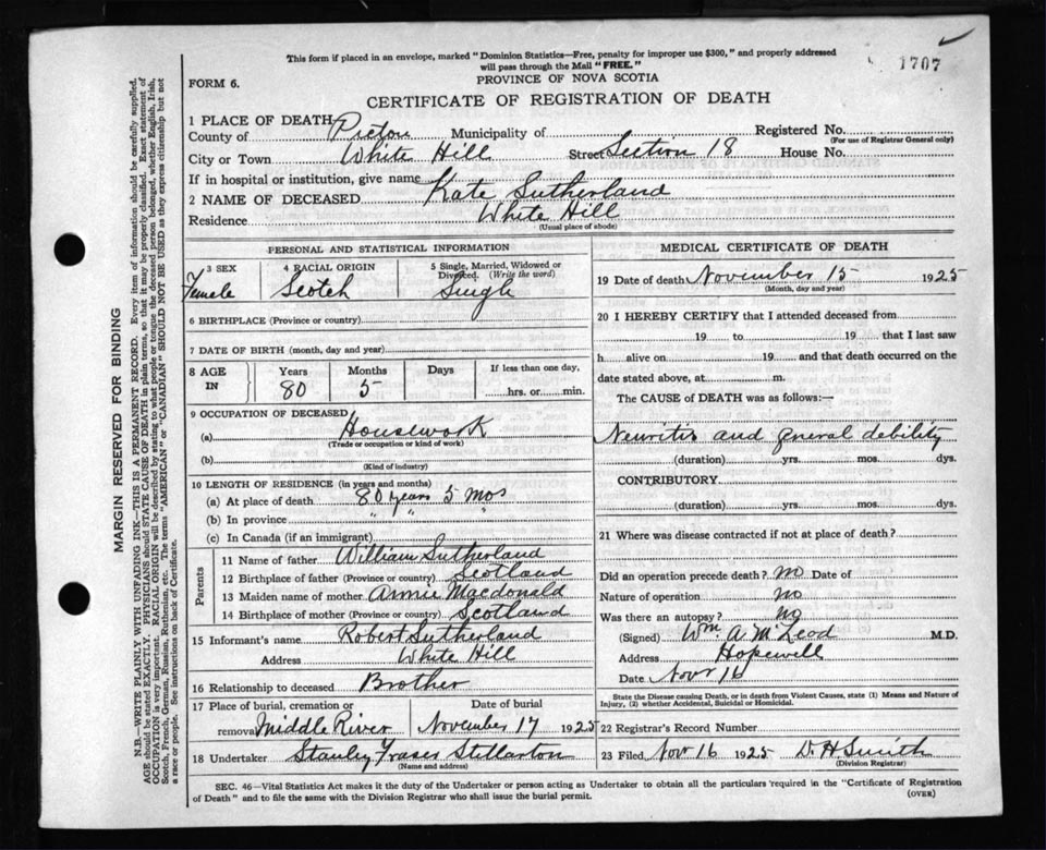 Death Registration: Year: 1925 file: 99 number: 1707