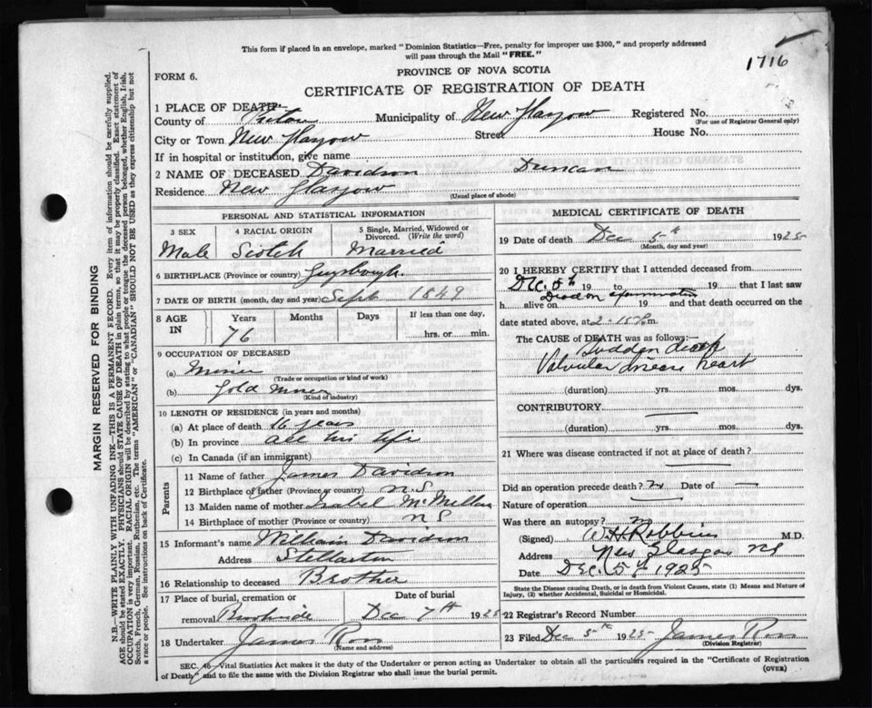 Death Registration: Year: 1925 file: 99 number: 1716