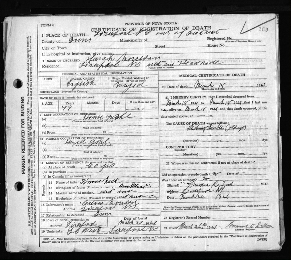 Death Registration: Year: 1921 file: 101 number: 169