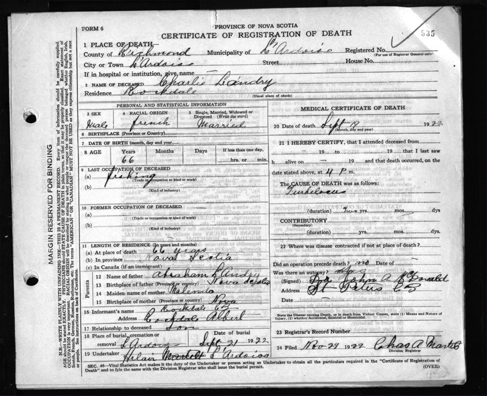 Male Death Registration: Year: 1922 file: 102 number: 535