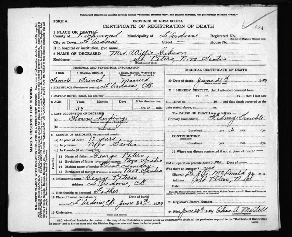 Female Death Registration: Year: 1924 file: 102 number: 884