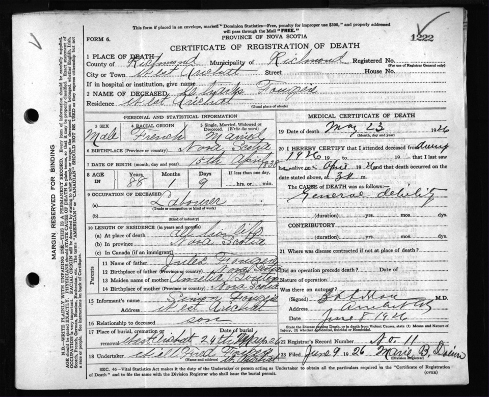 Male Death Registration: Year: 1926 file: 102 number: 1222