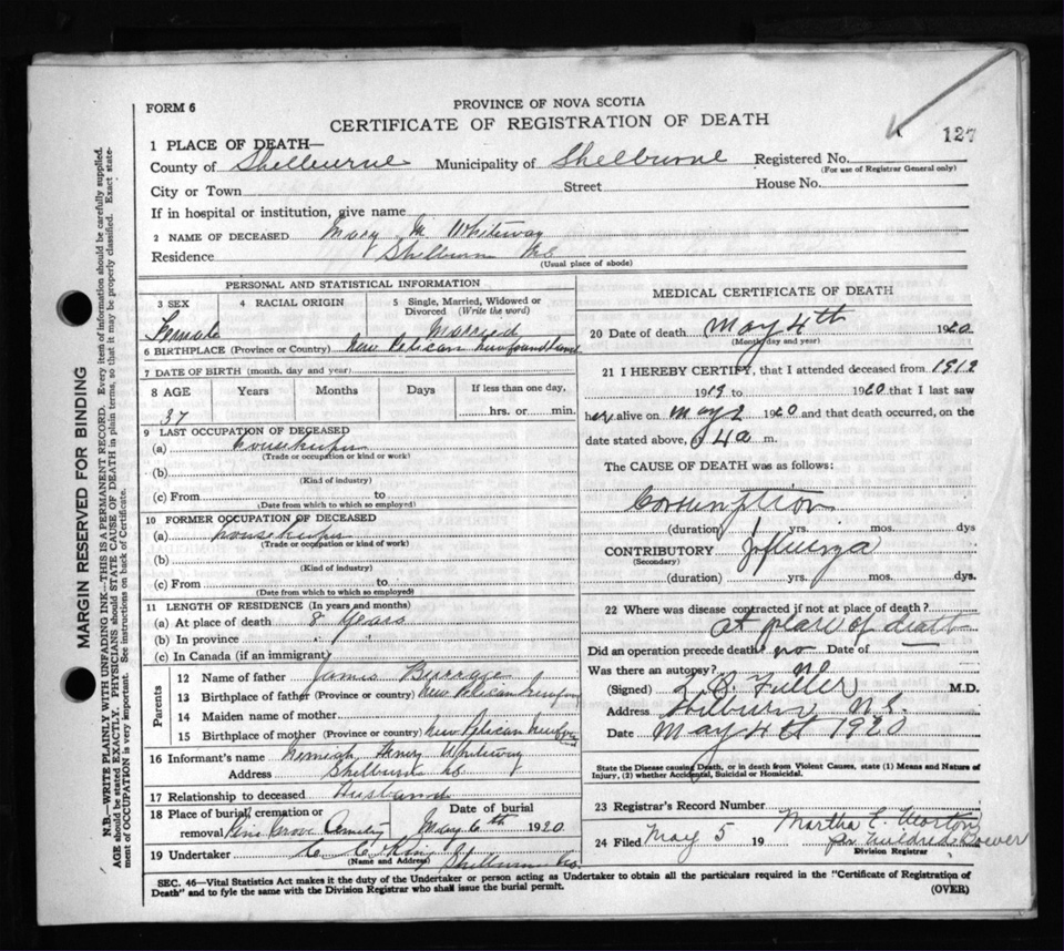 Death Registration: Year: 1920 file: 103 number: 127