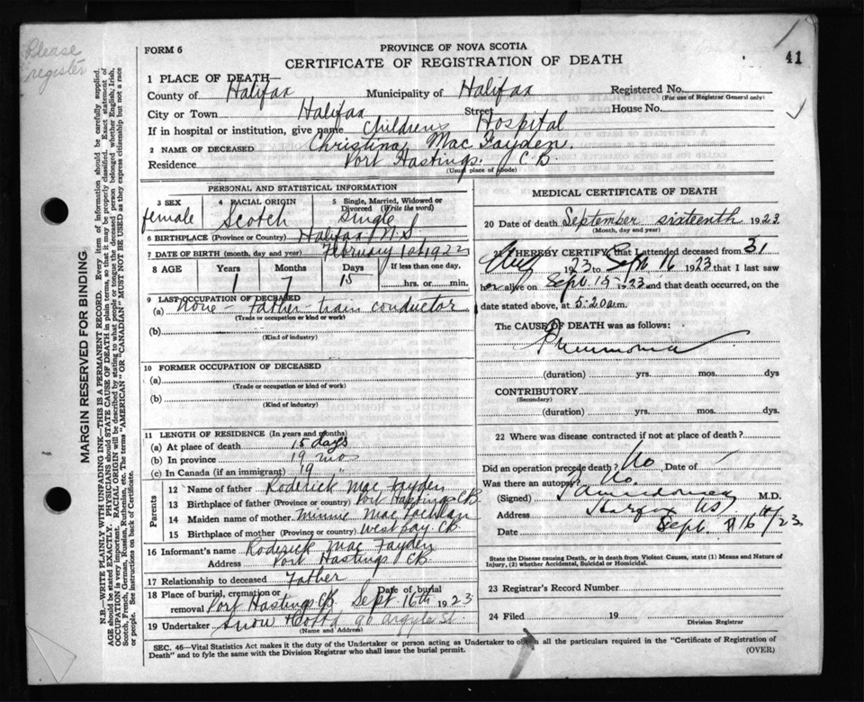 Death Registration: Year: 1923 file: 104 number: 41