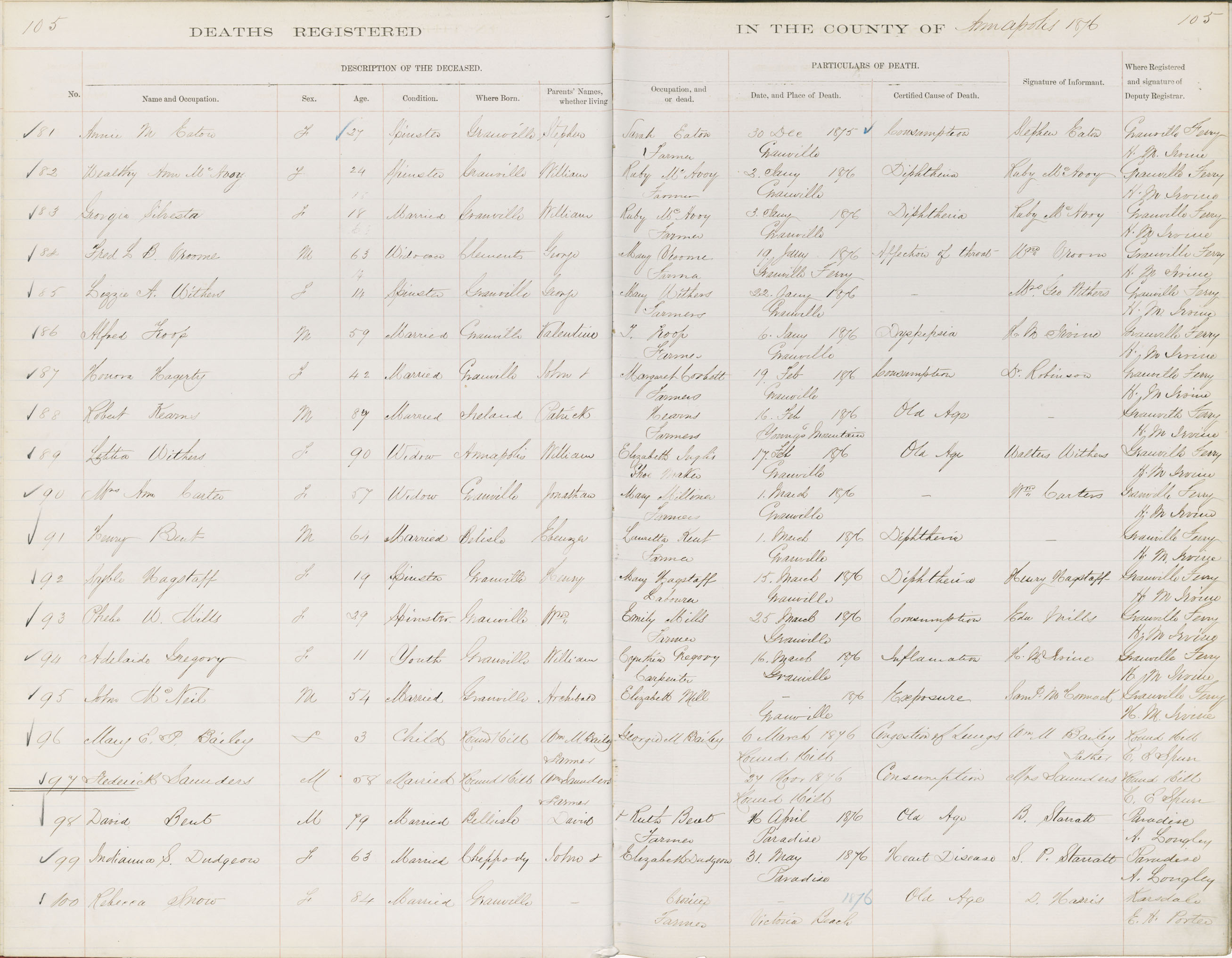 Death Registration: Year: 1874 book: 1801 page: 105 number: 100