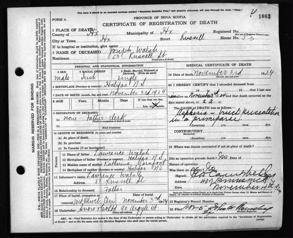 Death Registration: Year: 1924 file: 104 number: 1003