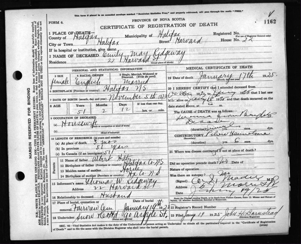Female Death Registration: Year: 1925 file: 104 number: 1162