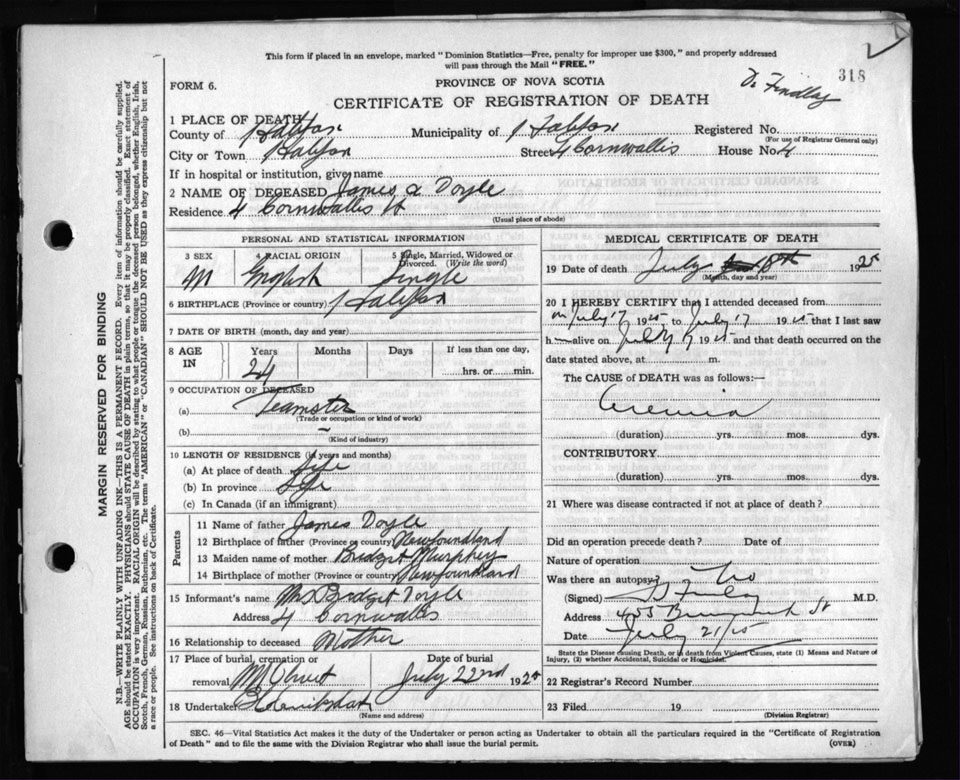 Death Registration: Year: 1925 file: 105 number: 318