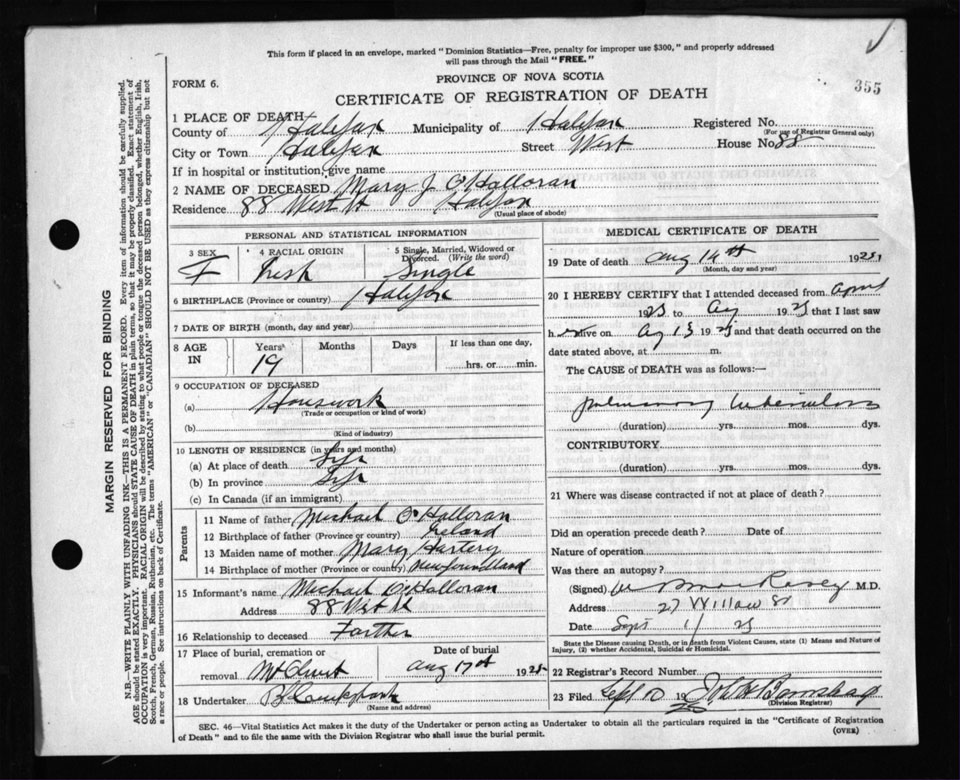 Death Registration: Year: 1925 file: 105 number: 355