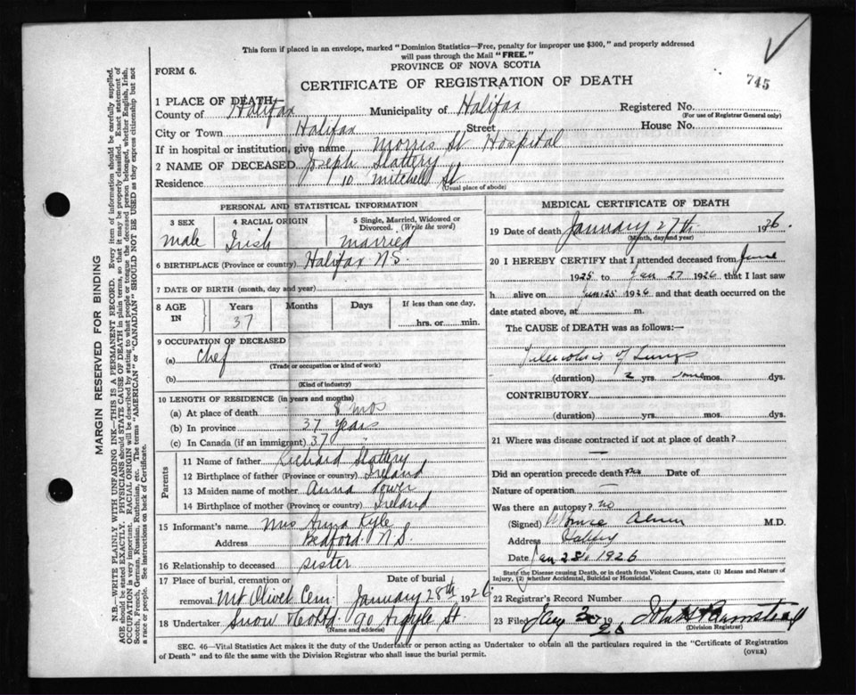 Male Death Registration: Year: 1926 file: 105 number: 745