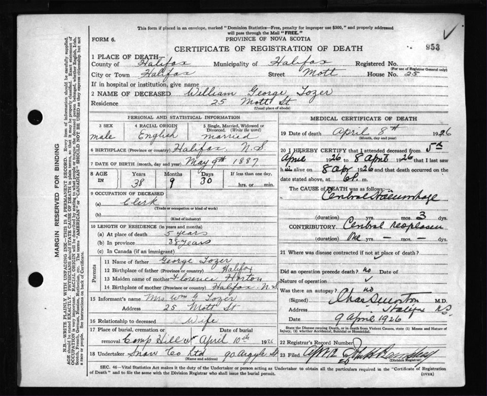 Male Death Registration: Year: 1926 file: 105 number: 953