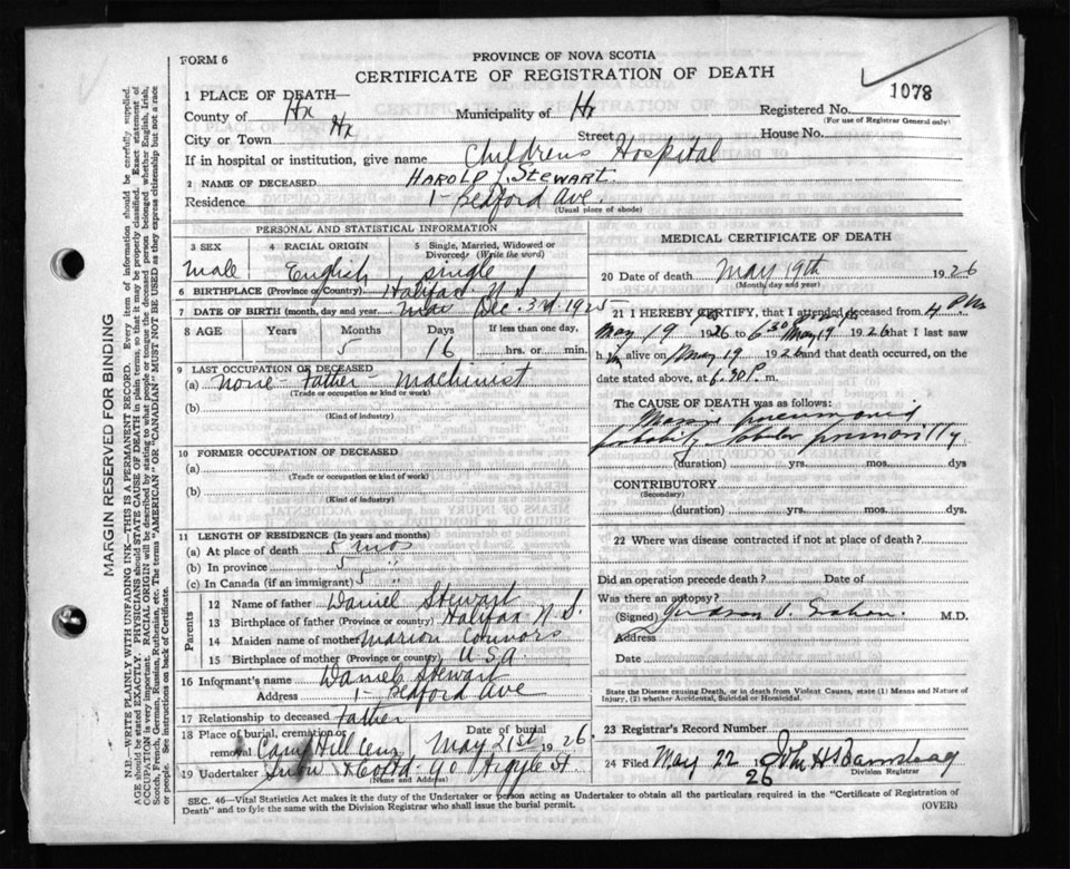 Death Registration: Year: 1926 file: 105 number: 1078