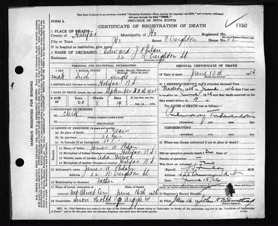 Death Registration: Year: 1926 file: 105 number: 1150