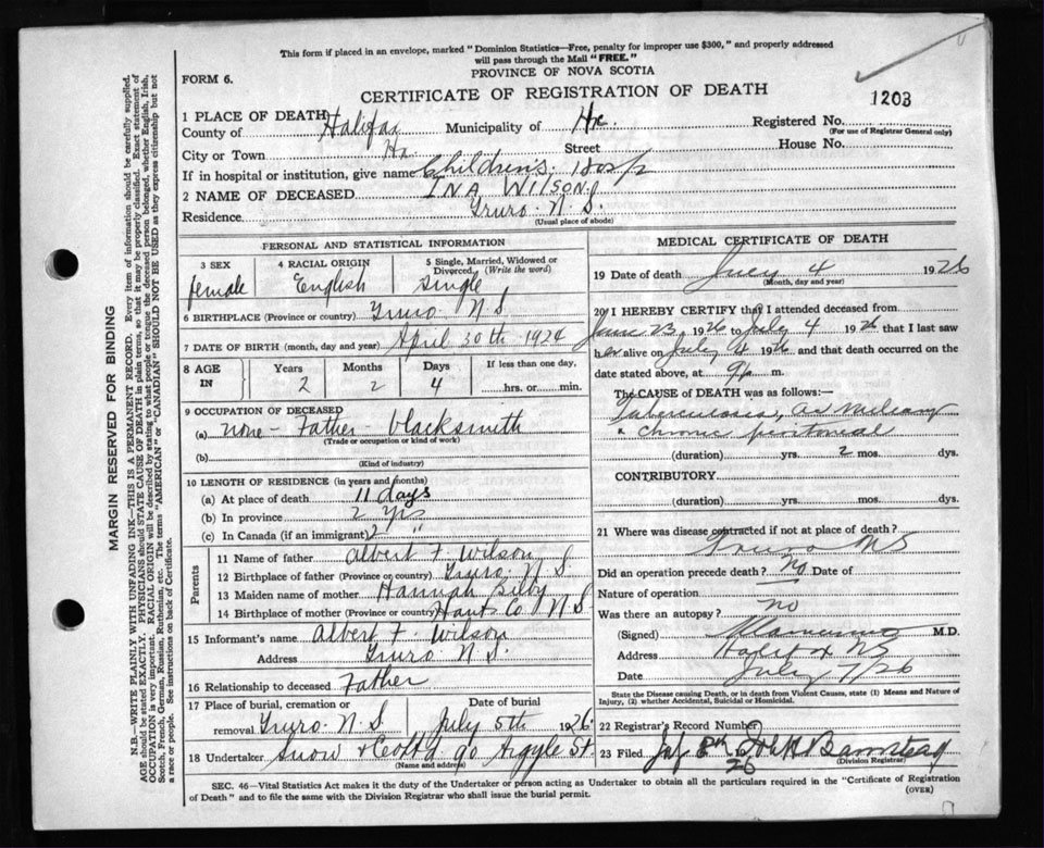 Death Registration: Year: 1926 file: 105 number: 1203