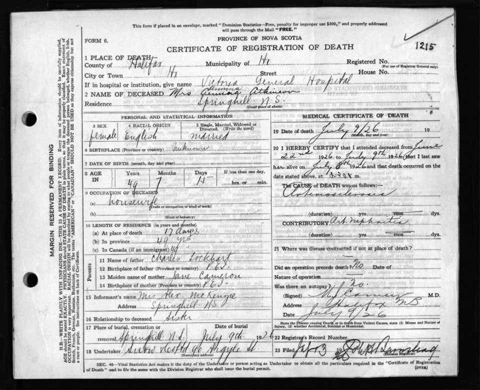 Death Registration: Year: 1926 file: 105 number: 1215