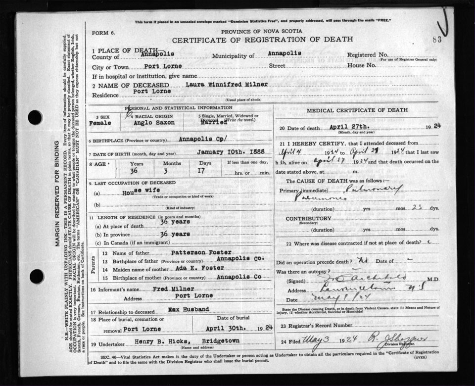 Death Registration: Year: 1924 file: 106 number: 83