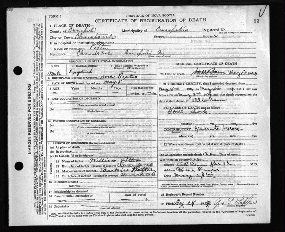 Male Death Registration: Year: 1924 file: 106 number: 93