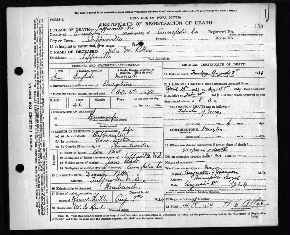 Death Registration: Year: 1924 file: 106 number: 153