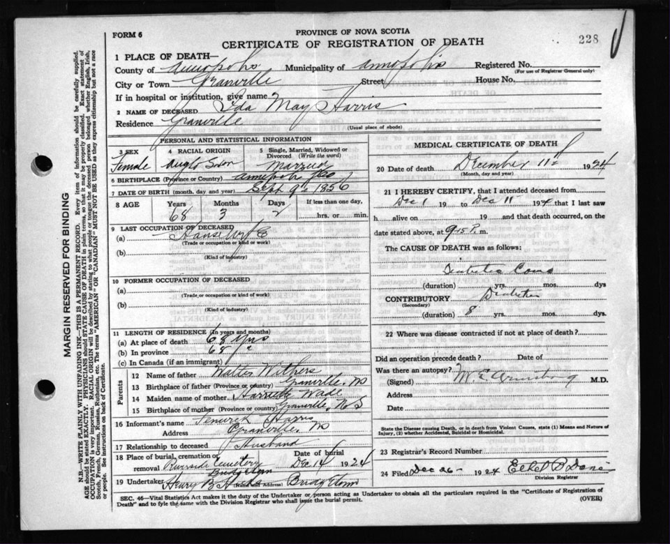 Death Registration: Year: 1924 file: 106 number: 228
