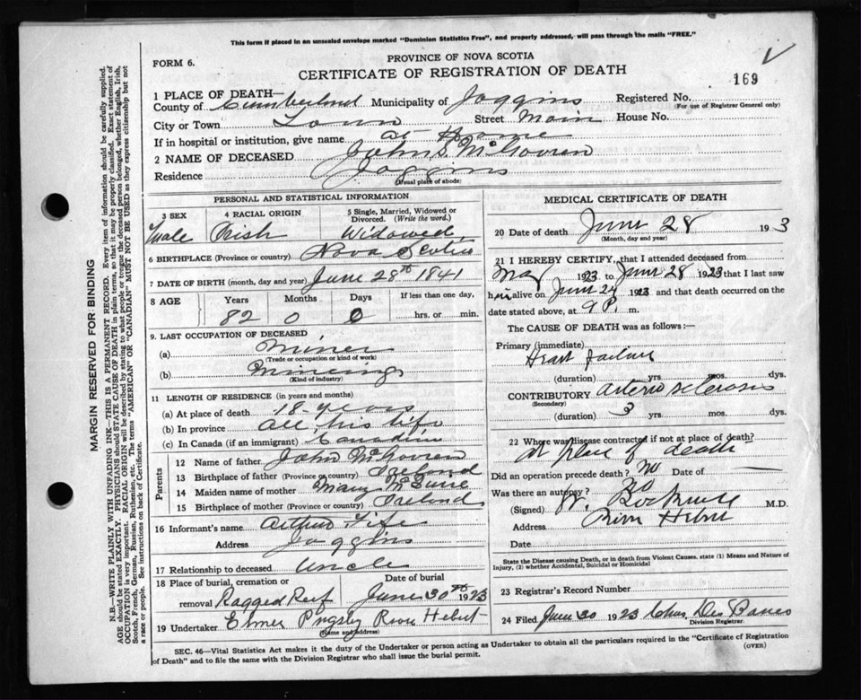 Death Registration: Year: 1923 file: 107 number: 169