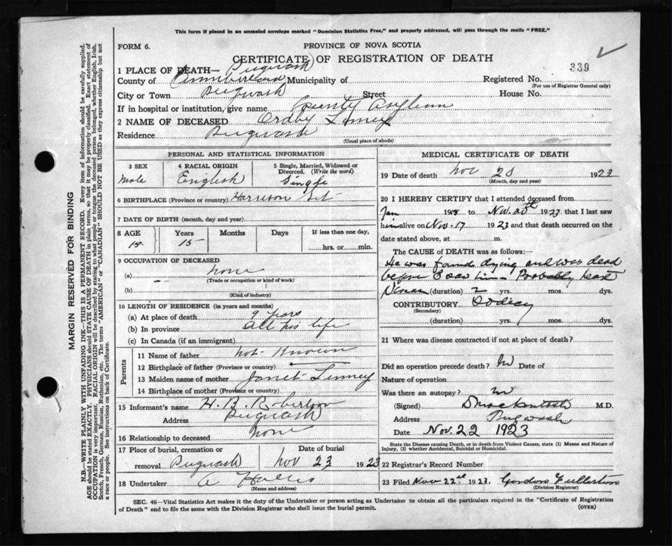 Death Registration: Year: 1923 file: 107 number: 339