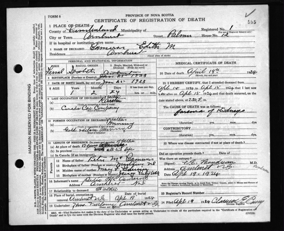 Death Registration: Year: 1924 file: 107 number: 555