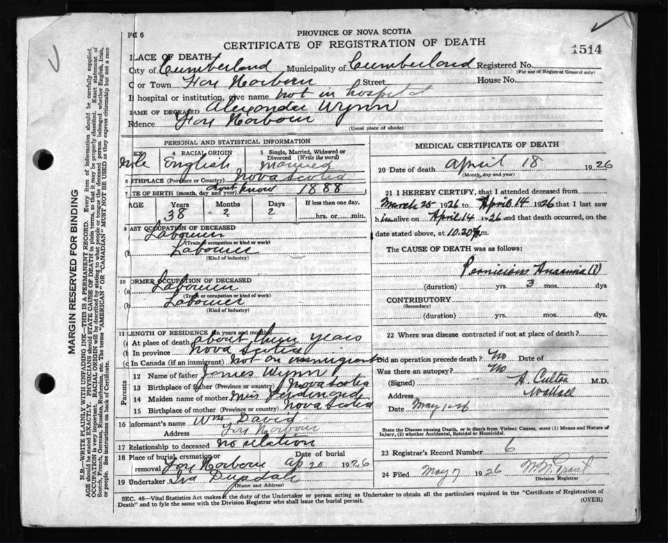Death Registration: Year: 1926 file: 107 number: 1514