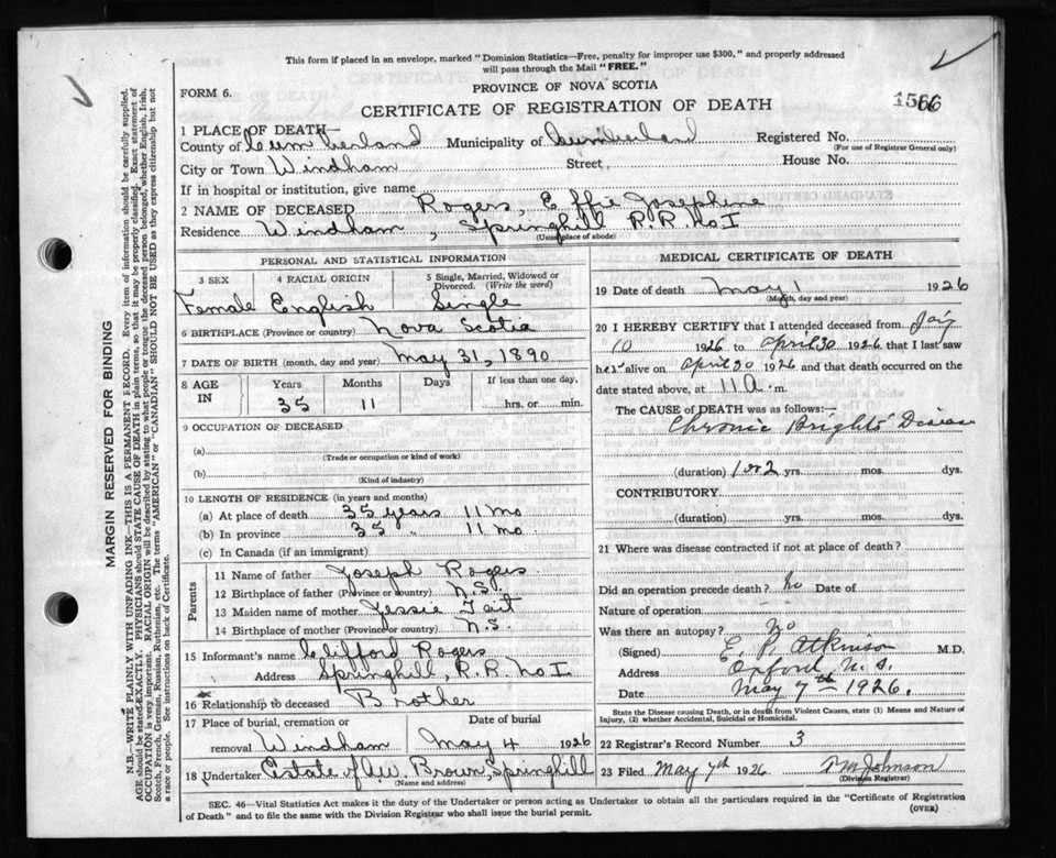 Death Registration: Year: 1926 file: 107 number: 1566