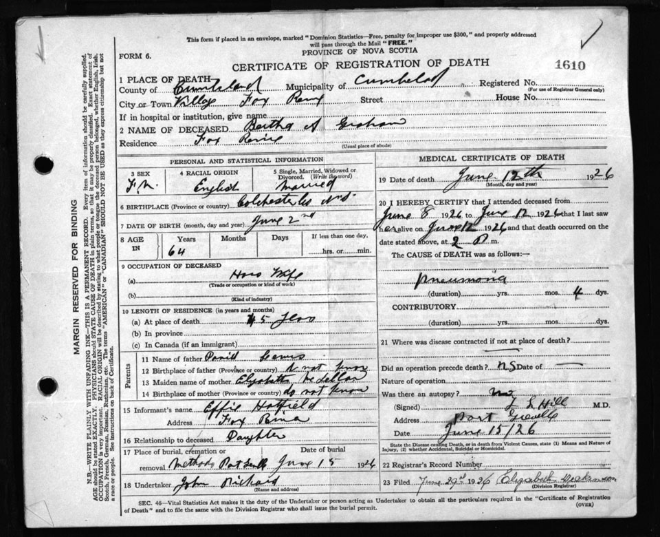 Death Registration: Year: 1926 file: 107 number: 1610