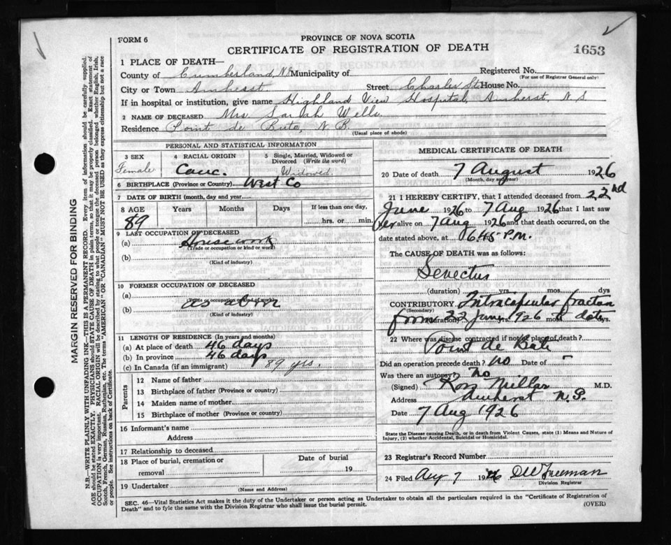 Death Registration: Year: 1926 file: 107 number: 1653