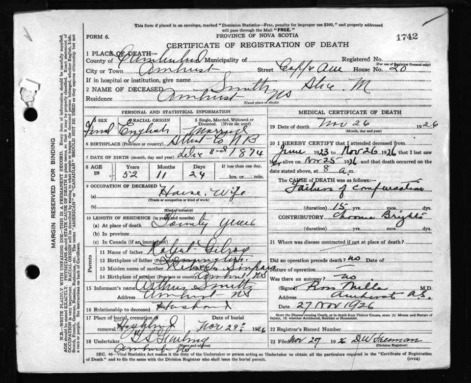 Death Registration: Year: 1926 file: 107 number: 1742