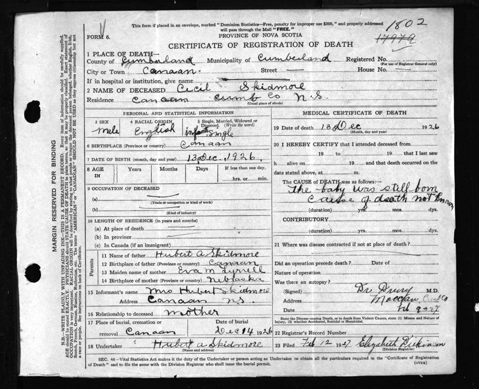 Death Registration: Year: 1926 file: 107 number: 1802