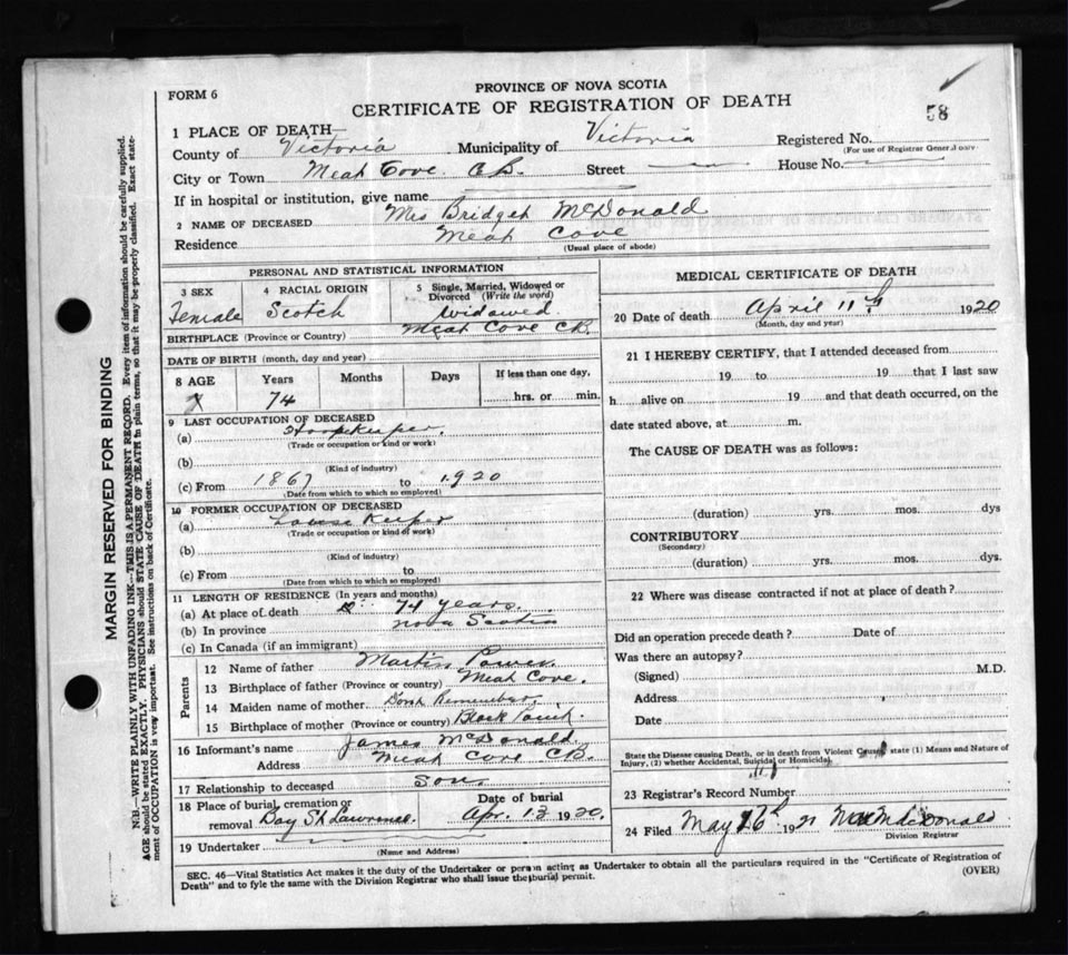 Death Registration: Year: 1920 file: 109 number: 58