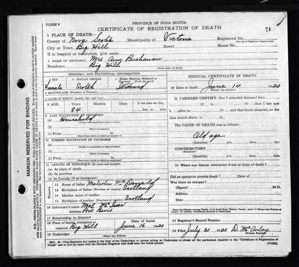 Death Registration: Year: 1920 file: 109 number: 78