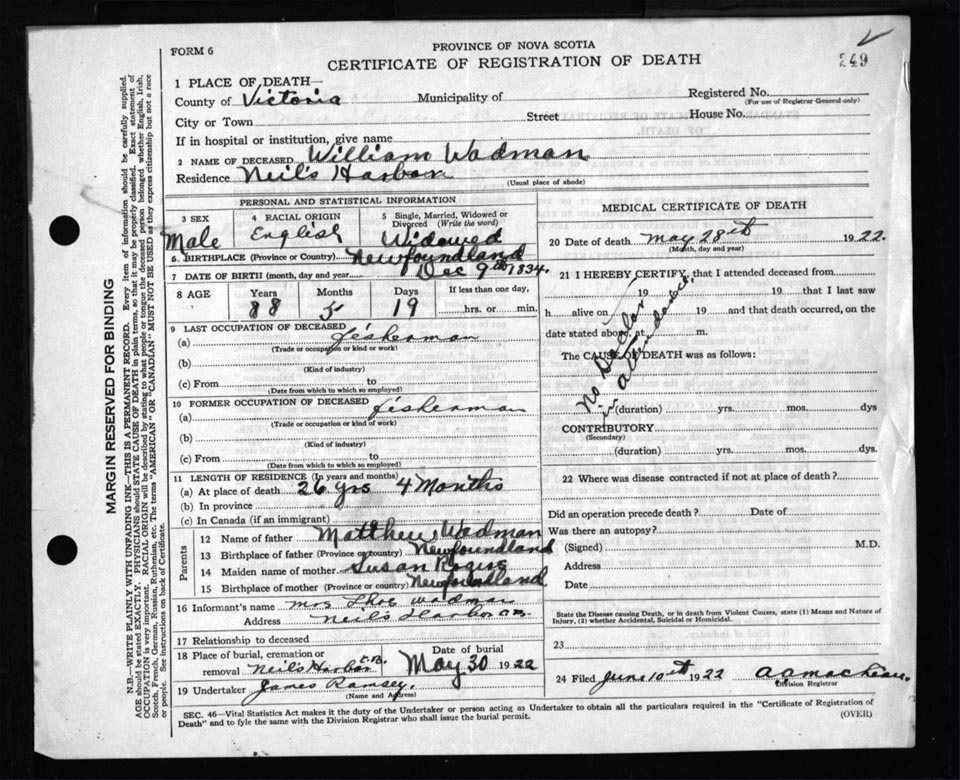 Death Registration: Year: 1922 file: 109 number: 249