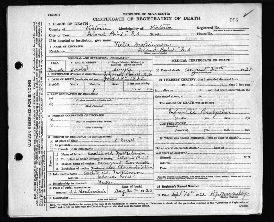 Death Registration: Year: 1922 file: 109 number: 266