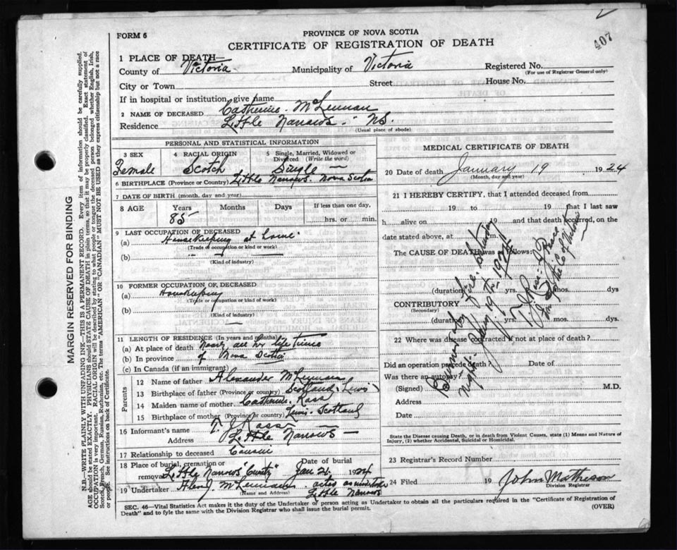 Death Registration: Year: 1924 file: 109 number: 407