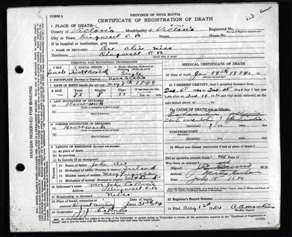 Death Registration: Year: 1924 file: 109 number: 413
