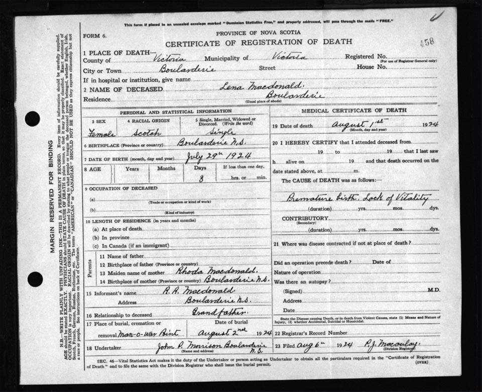 Death Registration: Year: 1924 file: 109 number: 458