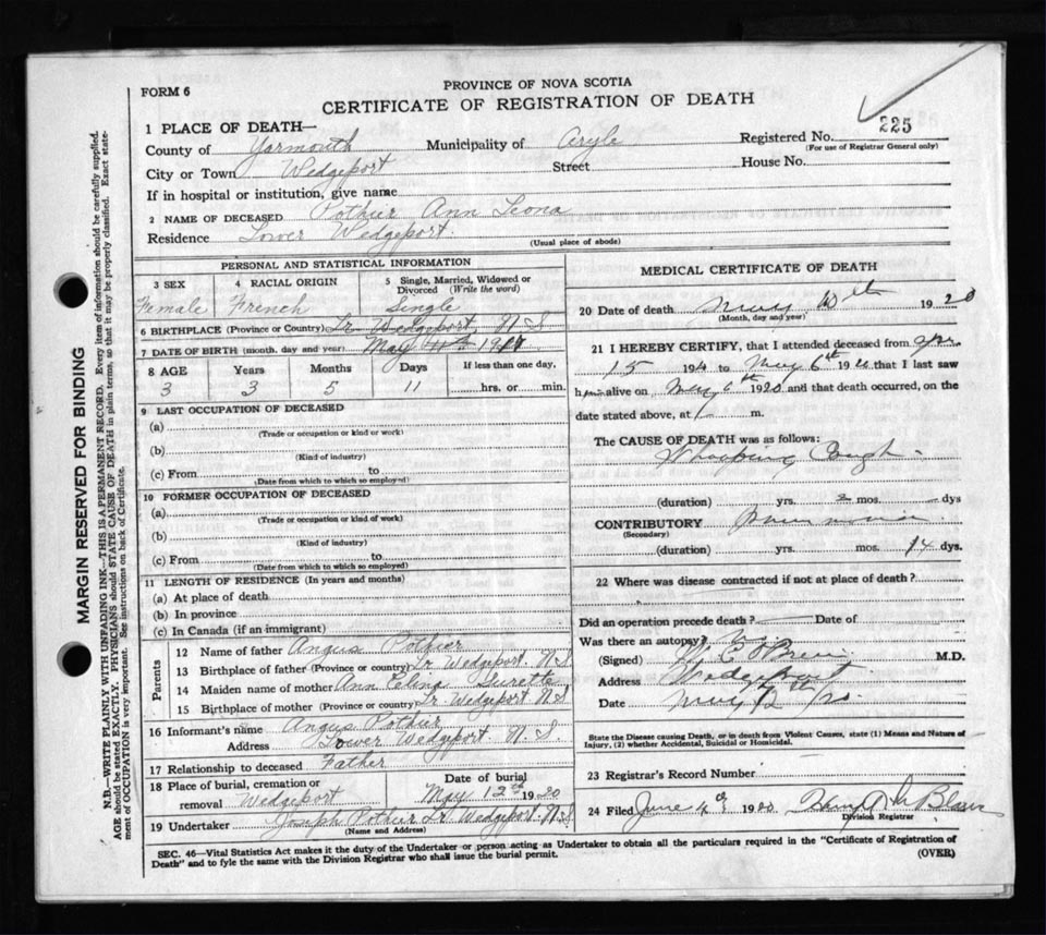 Death Registration: Year: 1920 file: 110 number: 225