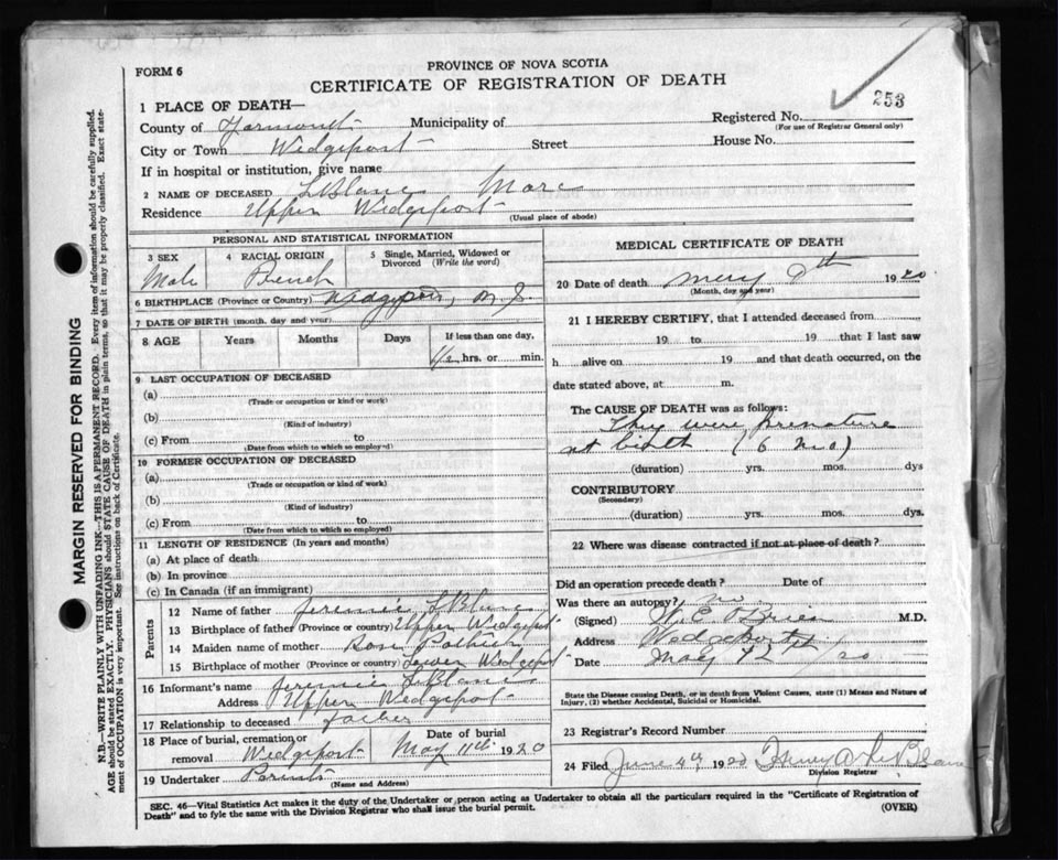 Death Registration: Year: 1920 file: 110 number: 253