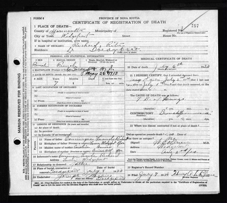 Death Registration: Year: 1920 file: 110 number: 297