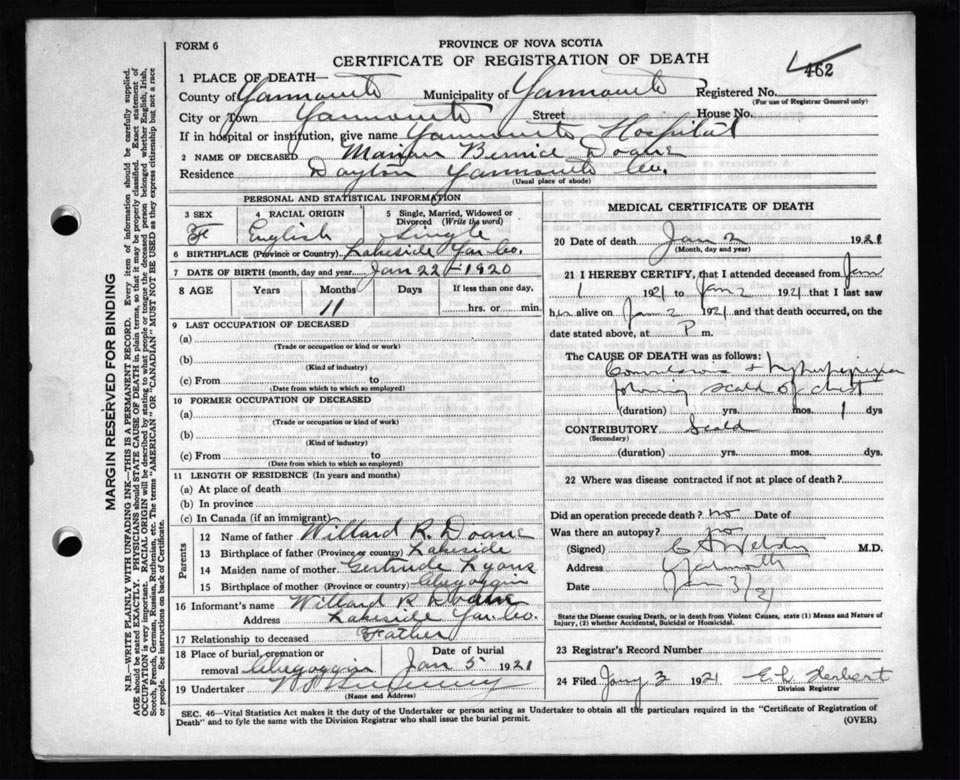 Death Registration: Year: 1921 file: 110 number: 462