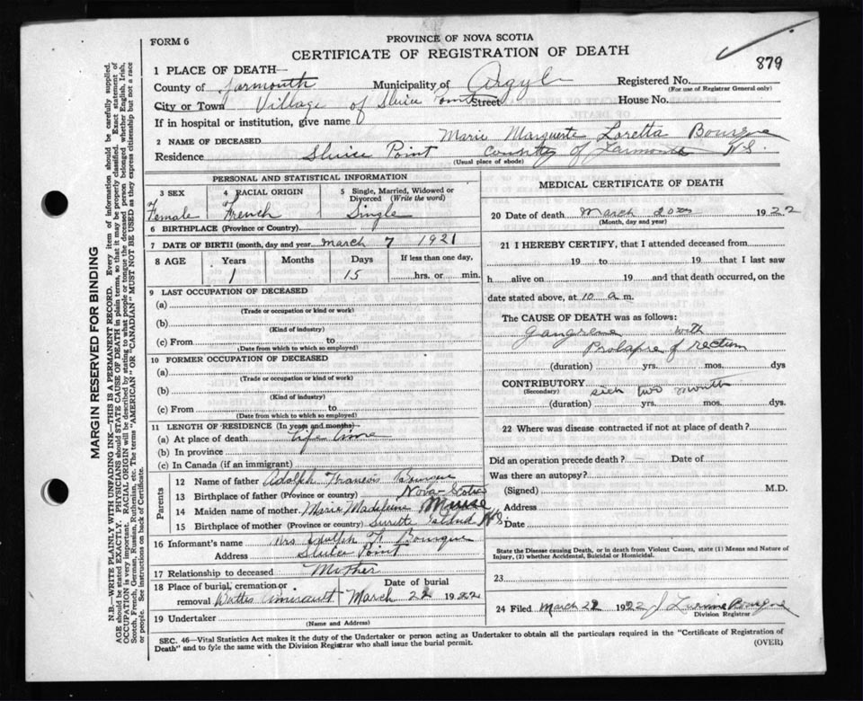 Death Registration: Year: 1922 file: 110 number: 879