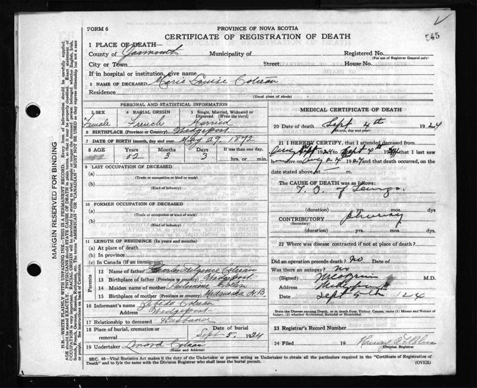 Death Registration: Year: 1924 file: 111 number: 545