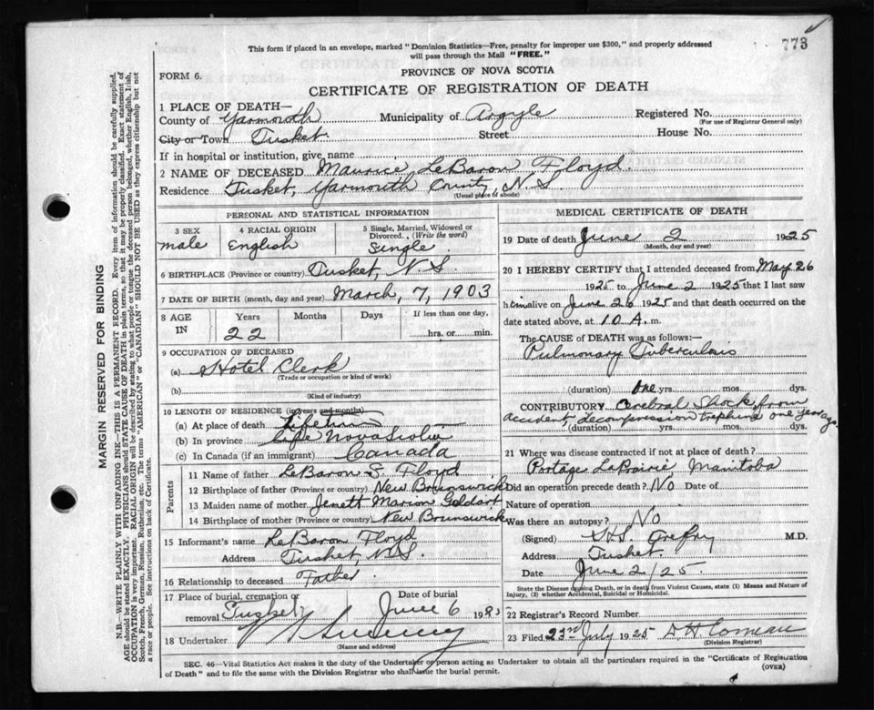 Death Registration: Year: 1925 file: 111 number: 773