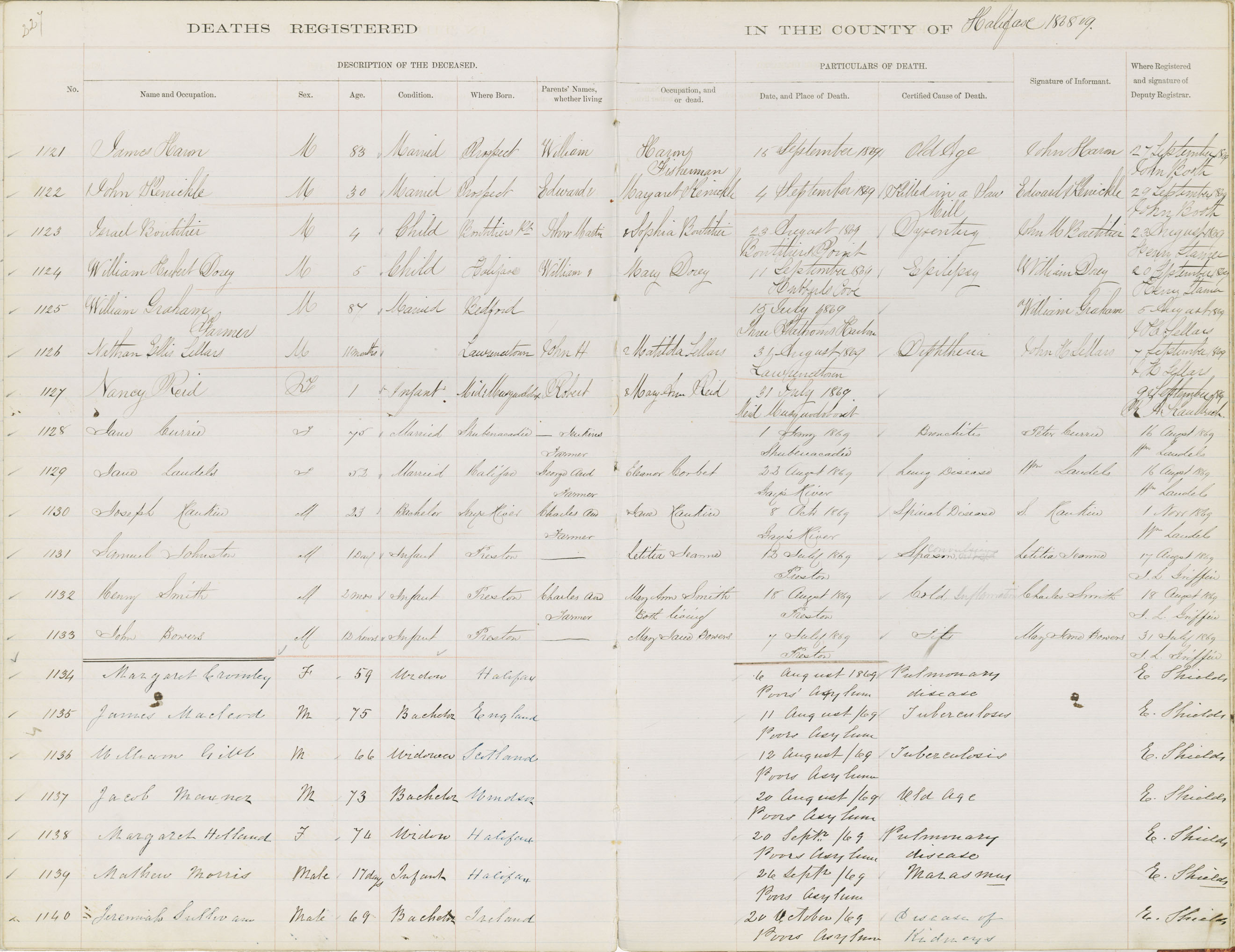 Death Registration: Year: 1869 book: 1808 page: 227 number: 1140