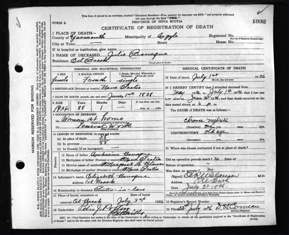 Death Registration: Year: 1926 file: 111 number: 1092