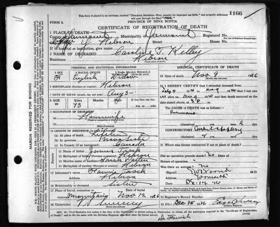 Death Registration: Year: 1926 file: 111 number: 1166